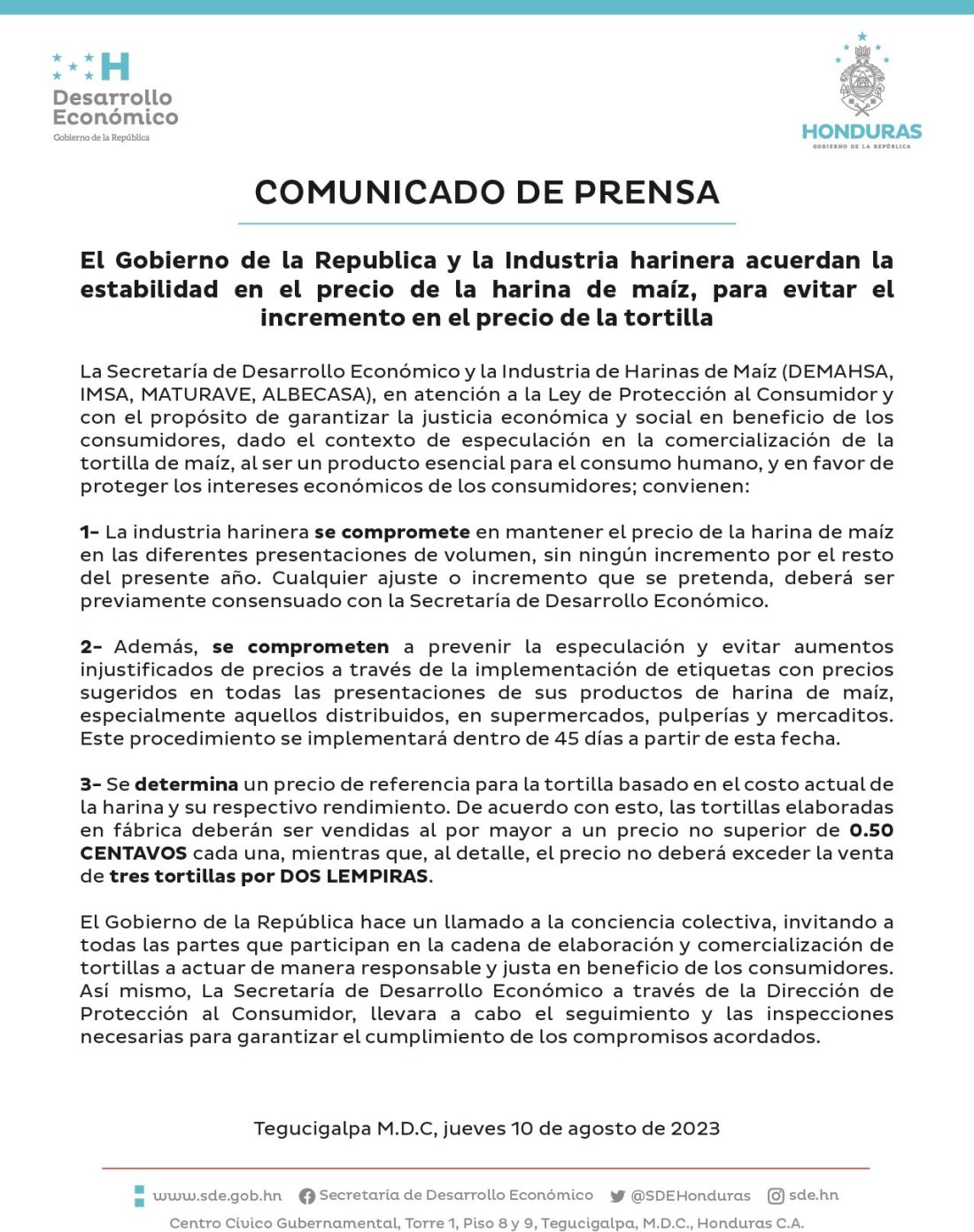 El Gobierno de la Republica y la Industria harinera acuerdan la estabilidad en el precio de la harina de maíz, para evitar el incremento en el precio de la tortilla